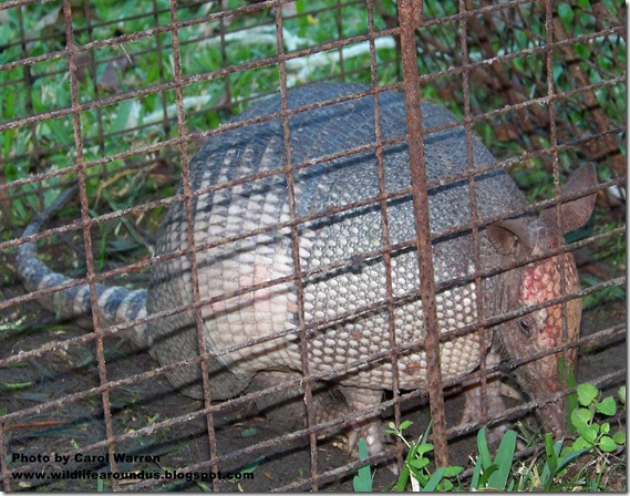 We caught one of the baby coons one night….let it go. Then a few mornings ago I was out checking the place out and feeding the bunnies when I spotted our next visitor…an Armadillo.