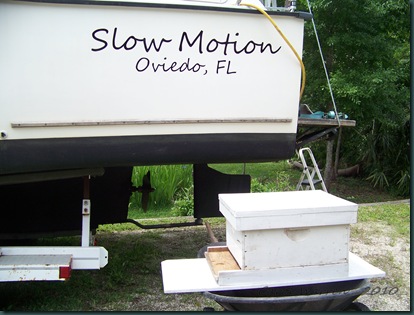 So….after I get this all together…sitting on a wheel barrow so I can move it once they decide they like it….I sit in the boat and watch the bees….they don’t show any interest at all…I couldn’t even get them to look at a plate with a bit of honey on it. So I washed the area on the boat that they were so interested in with soap and water…then put a piece of wet paper towel over the spot to discourage them…