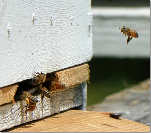The entrance looks pretty crowded to me. It’s 17 days since the first picture at the top was taken….definitely a few more bees today. You can see one of the reducers to the right of the hive.