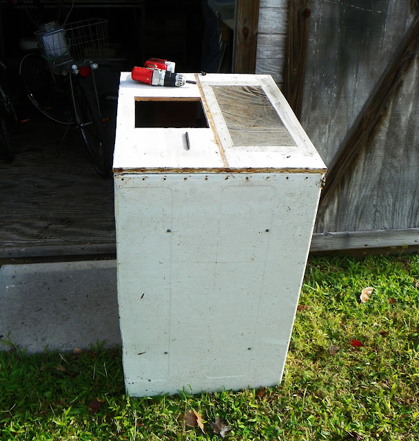 It sat on the back deck under cover and made a good place for them to sleep. They have since become a little more friendly so we put kitty doors into the screen porch…now they sleep there so we decided to make a house to put in the woods for the critters.